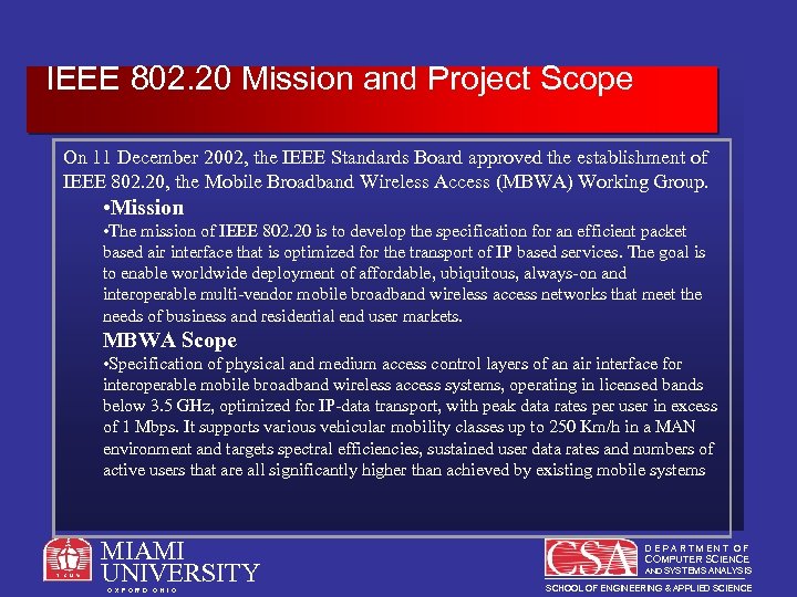 IEEE 802. 20 Mission and Project Scope On 11 December 2002, the IEEE Standards Board approved the establishment of IEEE 802. 20, the Mobile Broadband Wireless Access (MBWA) Working Group. • Mission • The mission of IEEE 802. 20 is to develop the specification for an efficient packet based air interface that is optimized for the transport of IP based services. The goal is to enable worldwide deployment of affordable, ubiquitous, always-on and interoperable multi-vendor mobile broadband wireless access networks that meet the needs of business and residential end user markets. MBWA Scope • Specification of physical and medium access control layers of an air interface for interoperable mobile broadband wireless access systems, operating in licensed bands below 3. 5 GHz, optimized for IP-data transport, with peak data rates per user in excess of 1 Mbps. It supports various vehicular mobility classes up to 250 Km/h in a MAN environment and targets spectral efficiencies, sustained user data rates and numbers of active users that are all significantly higher than achieved by existing mobile systems MIAMI UNIVERSITY O X F O R D O H I O DEPARTMENT OF COMPUTER SCIENCE AND SYSTEMS ANALYSIS SCHOOL OF ENGINEERING & APPLIED SCIENCE