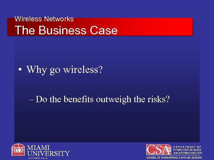 Wireless Networks The Business Case • Why go wireless? – Do the benefits outweigh the risks? MIAMI UNIVERSITY O X F O R D O H I O DEPARTMENT OF COMPUTER SCIENCE AND SYSTEMS ANALYSIS SCHOOL OF ENGINEERING & APPLIED SCIENCE