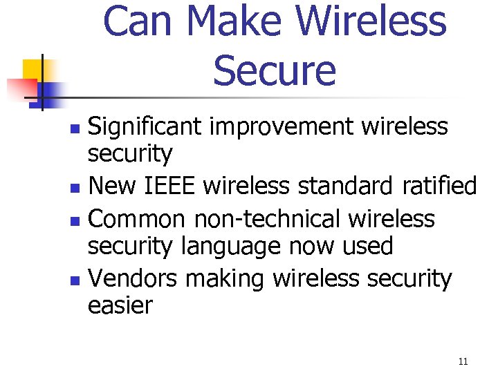 Can Make Wireless Secure Significant improvement wireless security n New IEEE wireless standard ratified n Common non-technical wireless security language now used n Vendors making wireless security easier n 11