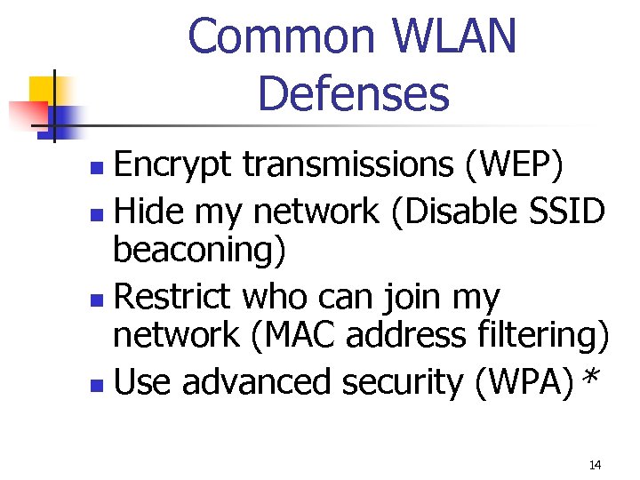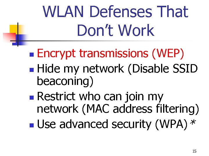 Common WLAN Defenses Encrypt transmissions (WEP) n Hide my network (Disable SSID beaconing) n Restrict who can join my network (MAC address filtering) n Use advanced security (WPA)* n 14