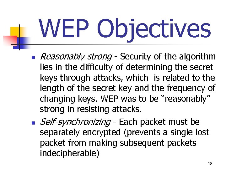 WEP Objectives n n n Efficient - Algorithm must be proficient enough to be implemented in either hardware or software Exportable - Must meet the guidelines set by the U. S. Department of Commence so wireless device using WEP can be exported overseas Optional - The implementation of WEP in wireless LANs is an optional feature 17