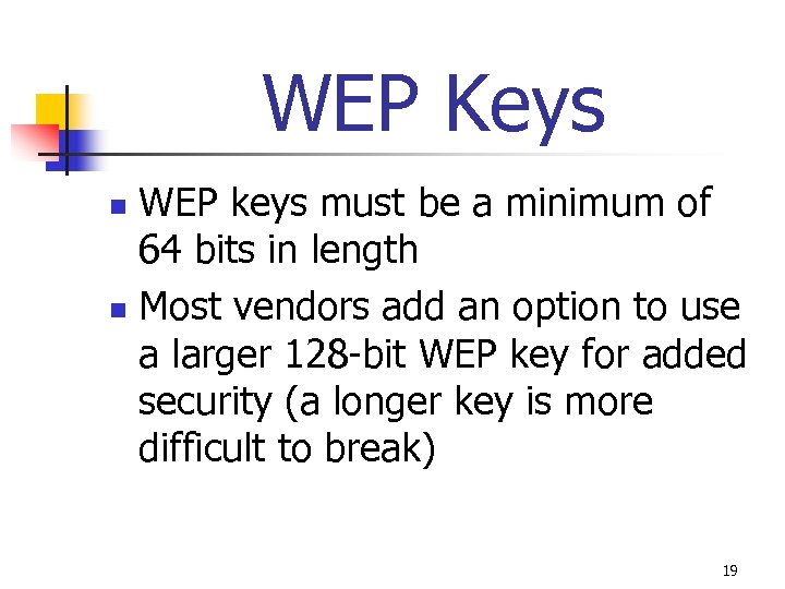 WEP Keys WEP keys must be a minimum of 64 bits in length n Most vendors add an option to use a larger 128 -bit WEP key for added security (a longer key is more difficult to break) n 19