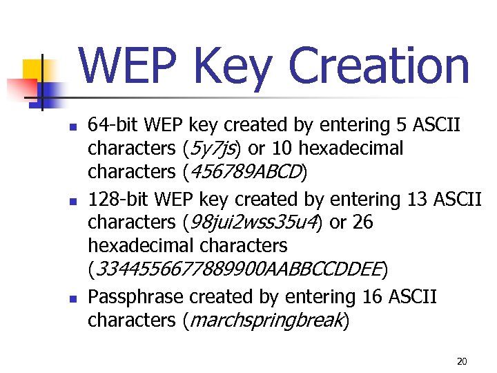 WEP Key Creation n 64 -bit WEP key created by entering 5 ASCII characters (5 y 7 js) or 10 hexadecimal characters (456789 ABCD) 128 -bit WEP key created by entering 13 ASCII characters (98 jui 2 wss 35 u 4) or 26 hexadecimal characters (3344556677889900 AABBCCDDEE) Passphrase created by entering 16 ASCII characters (marchspringbreak) 20