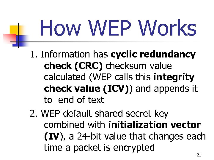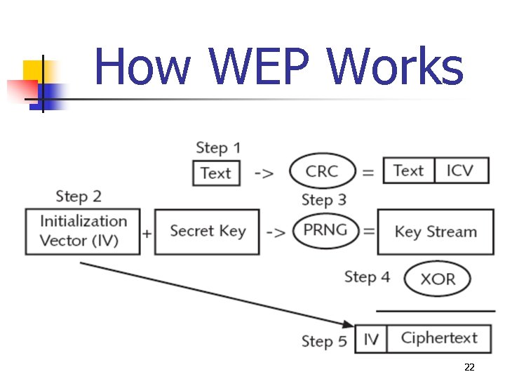 How WEP Works 1. Information has cyclic redundancy check (CRC) checksum value calculated (WEP calls this integrity check value (ICV)) and appends it to end of text 2. WEP default shared secret key combined with initialization vector (IV), a 24 -bit value that changes each time a packet is encrypted 21