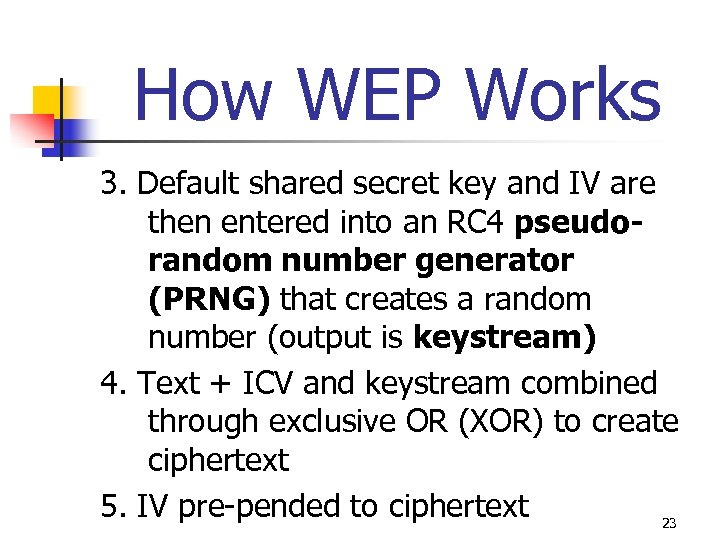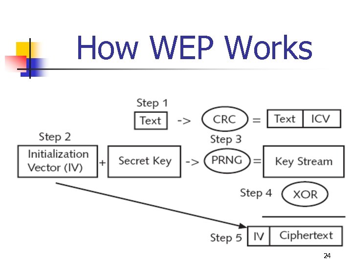 How WEP Works 3. Default shared secret key and IV are then entered into an RC 4 pseudorandom number generator (PRNG) that creates a random number (output is keystream) 4. Text + ICV and keystream combined through exclusive OR (XOR) to create ciphertext 5. IV pre-pended to ciphertext 23