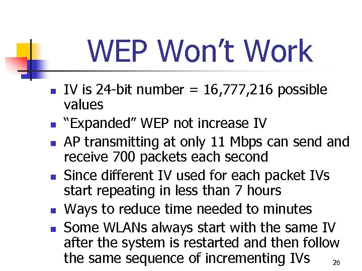 WEP Won’t Work n n n WEP creates a detectable pattern for attackers (weak keys) Attacker who captures packets for length of time can see the duplication and use it to crack the code Weakness is with initialization vector (IV), 24 -bit value that changes each time a packet is encrypted 25