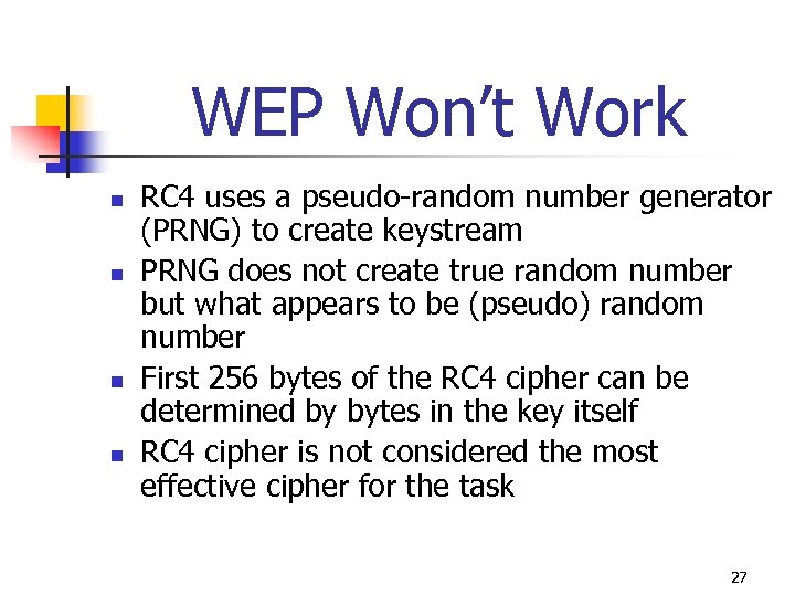 WEP Won’t Work n n n IV is 24 -bit number = 16, 777, 216 possible values “Expanded” WEP not increase IV AP transmitting at only 11 Mbps can send and receive 700 packets each second Since different IV used for each packet IVs start repeating in less than 7 hours Ways to reduce time needed to minutes Some WLANs always start with the same IV after the system is restarted and then follow the same sequence of incrementing IVs 26