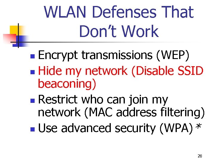 WLAN Defenses That Don’t Work Encrypt transmissions (WEP) n Hide my network (Disable SSID beaconing) n Restrict who can join my network (MAC address filtering) n Use advanced security (WPA)* n 28