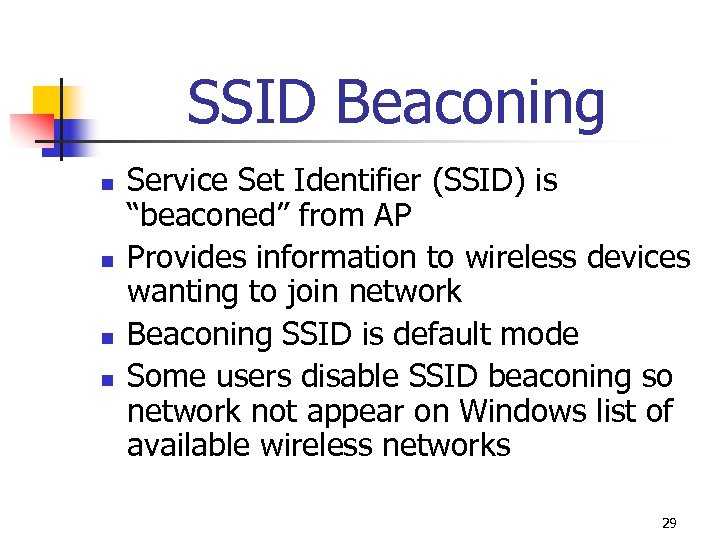 SSID Beaconing n n Service Set Identifier (SSID) is “beaconed” from AP Provides information to wireless devices wanting to join network Beaconing SSID is default mode Some users disable SSID beaconing so network not appear on Windows list of available wireless networks 29
