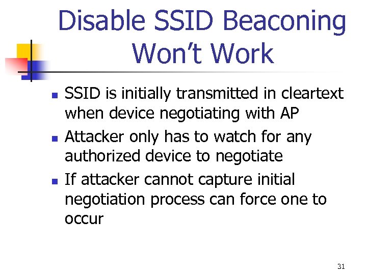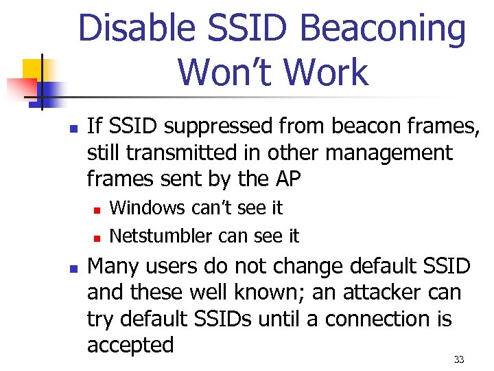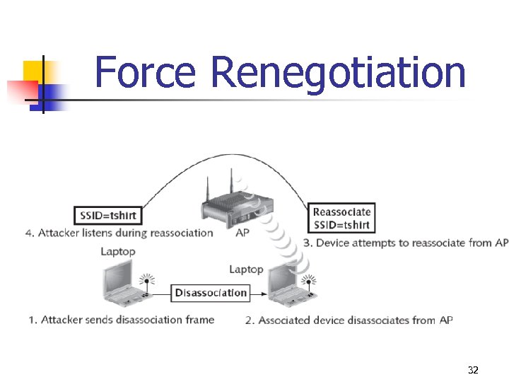 Disable SSID Beaconing Won’t Work n n n SSID is initially transmitted in cleartext when device negotiating with AP Attacker only has to watch for any authorized device to negotiate If attacker cannot capture initial negotiation process can force one to occur 31