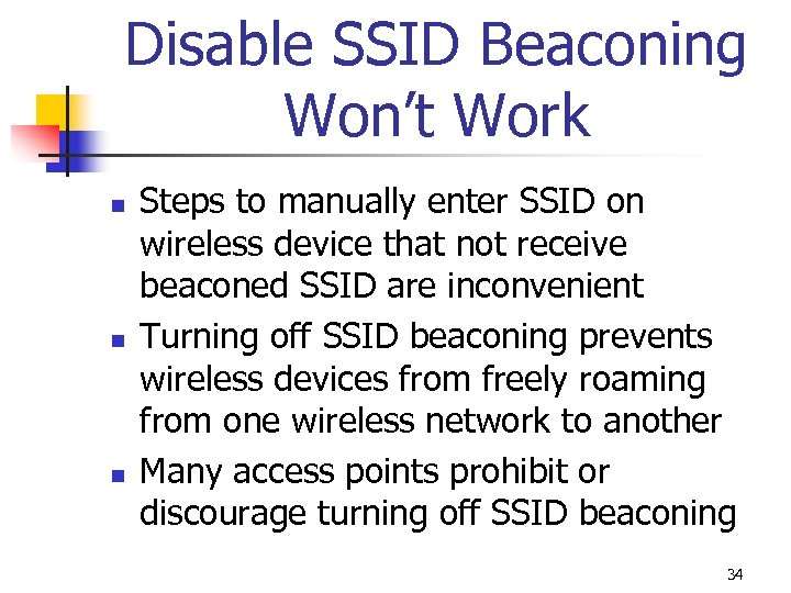 Disable SSID Beaconing Won’t Work n If SSID suppressed from beacon frames, still transmitted in other management frames sent by the AP n n n Windows can’t see it Netstumbler can see it Many users do not change default SSID and these well known; an attacker can try default SSIDs until a connection is accepted 33