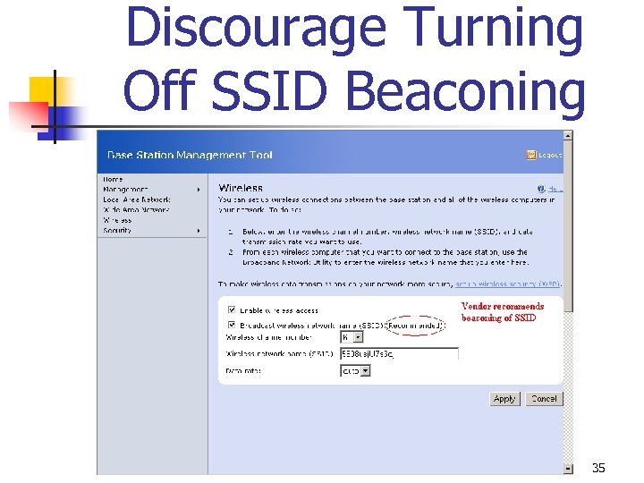 Disable SSID Beaconing Won’t Work n n n Steps to manually enter SSID on wireless device that not receive beaconed SSID are inconvenient Turning off SSID beaconing prevents wireless devices from freely roaming from one wireless network to another Many access points prohibit or discourage turning off SSID beaconing 34