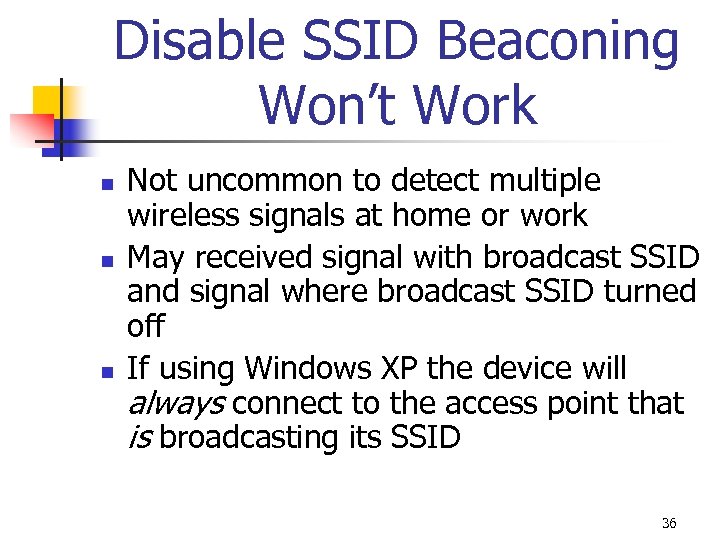 Disable SSID Beaconing Won’t Work n n n Not uncommon to detect multiple wireless signals at home or work May received signal with broadcast SSID and signal where broadcast SSID turned off If using Windows XP the device will always connect to the access point that is broadcasting its SSID 36