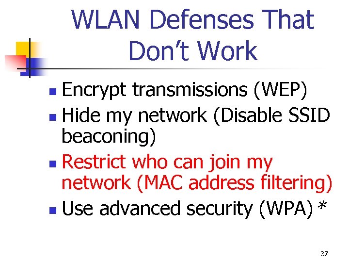 WLAN Defenses That Don’t Work Encrypt transmissions (WEP) n Hide my network (Disable SSID beaconing) n Restrict who can join my network (MAC address filtering) n Use advanced security (WPA)* n 37