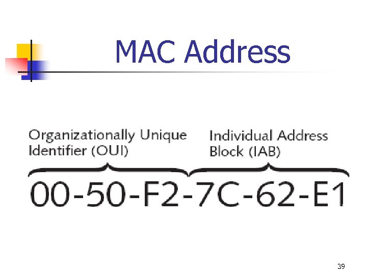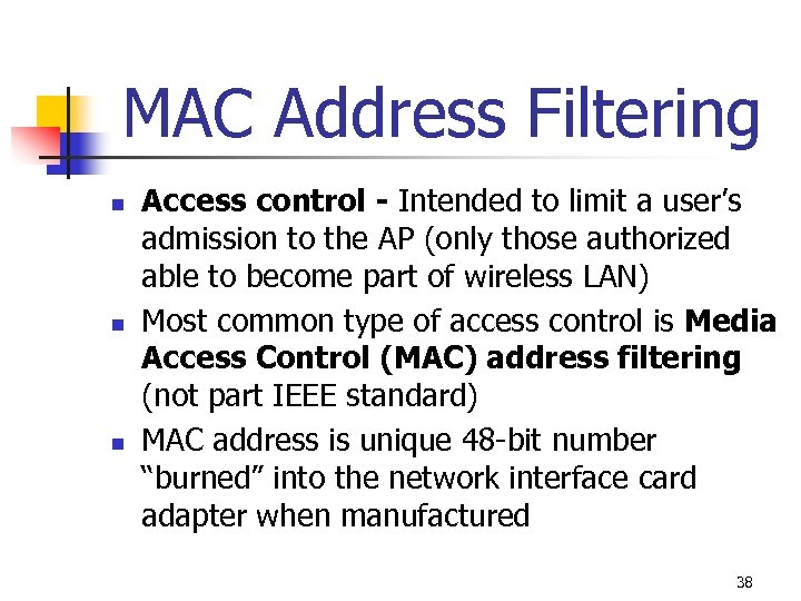 MAC Address Filtering n n n Access control - Intended to limit a user’s admission to the AP (only those authorized able to become part of wireless LAN) Most common type of access control is Media Access Control (MAC) address filtering (not part IEEE standard) MAC address is unique 48 -bit number “burned” into the network interface card adapter when manufactured 38