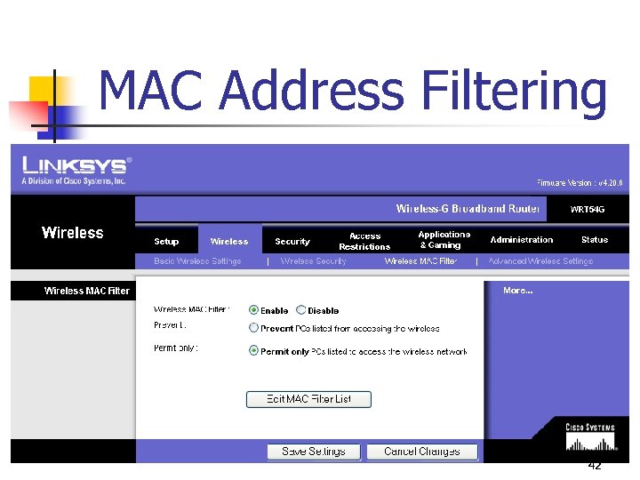 MAC Address Filtering n n Access to the wireless network can be restricted by entering the MAC address of approved or denied devices Once the MAC addresses are entered, only specific devices can be authenticated based on MAC address 41
