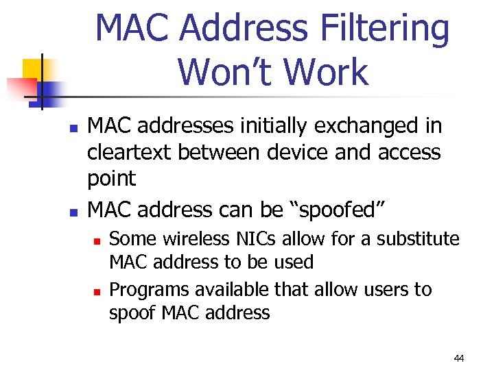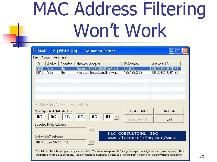 MAC Address Filtering Won’t Work n n MAC addresses initially exchanged in cleartext between device and access point MAC address can be “spoofed” n n Some wireless NICs allow for a substitute MAC address to be used Programs available that allow users to spoof MAC address 44