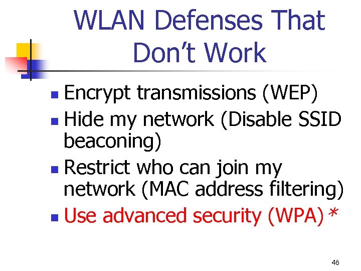 WLAN Defenses That Don’t Work Encrypt transmissions (WEP) n Hide my network (Disable SSID beaconing) n Restrict who can join my network (MAC address filtering) n Use advanced security (WPA)* n 46