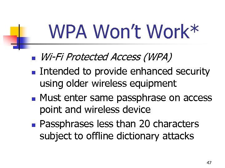 WPA Won’t Work* n n Wi-Fi Protected Access (WPA) Intended to provide enhanced security using older wireless equipment Must enter same passphrase on access point and wireless device Passphrases less than 20 characters subject to offline dictionary attacks 47