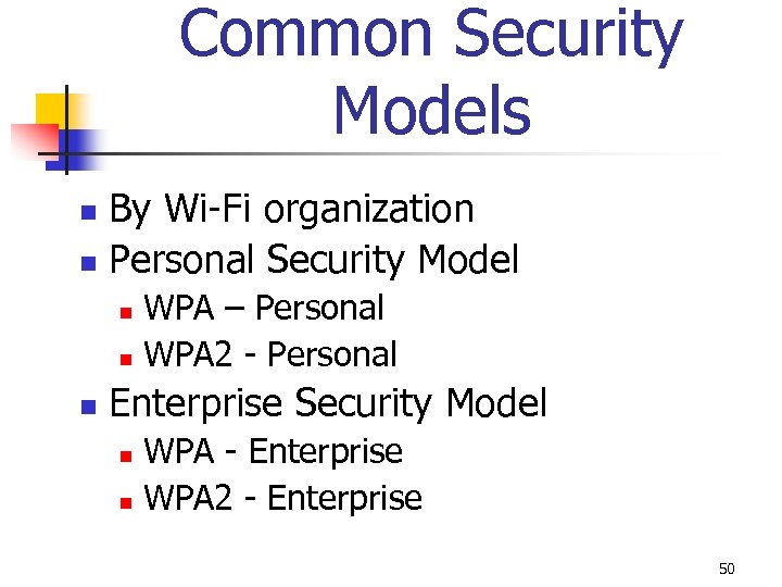 Common Security Models By Wi-Fi organization n Personal Security Model n WPA – Personal n WPA 2 - Personal n n Enterprise Security Model WPA - Enterprise n WPA 2 - Enterprise n 50