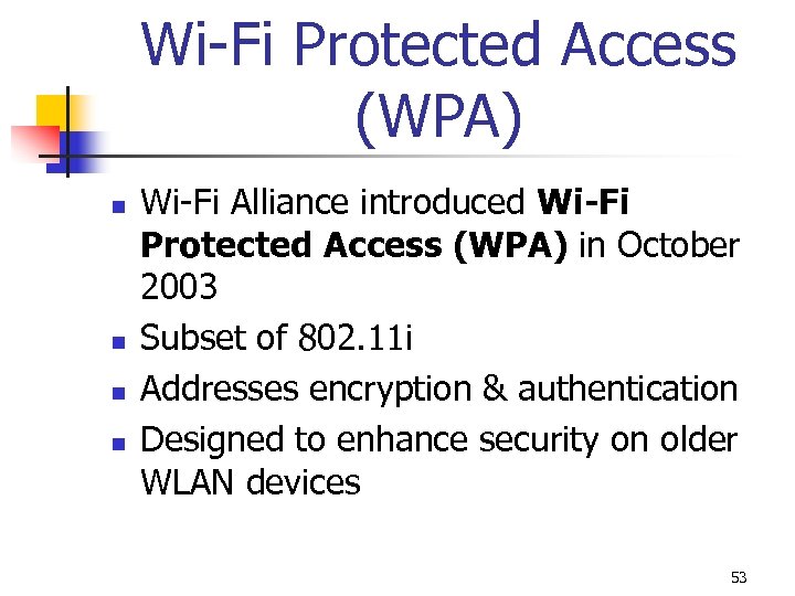 Wi-Fi Protected Access (WPA) n n Wi-Fi Alliance introduced Wi-Fi Protected Access (WPA) in October 2003 Subset of 802. 11 i Addresses encryption & authentication Designed to enhance security on older WLAN devices 53