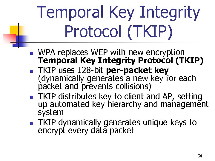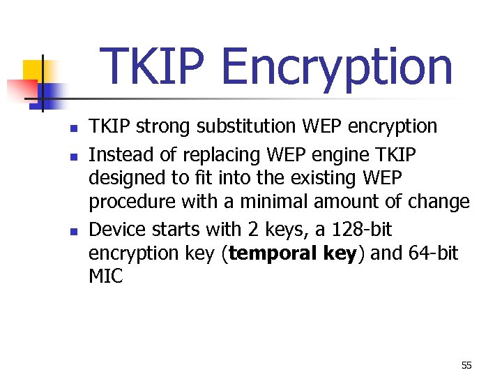 Temporal Key Integrity Protocol (TKIP) n n WPA replaces WEP with new encryption Temporal Key Integrity Protocol (TKIP) TKIP uses 128 -bit per-packet key (dynamically generates a new key for each packet and prevents collisions) TKIP distributes key to client and AP, setting up automated key hierarchy and management system TKIP dynamically generates unique keys to encrypt every data packet 54