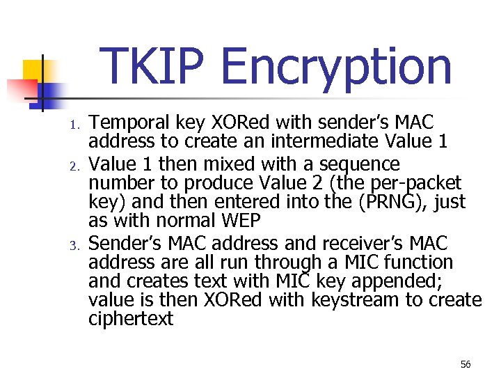 TKIP Encryption n TKIP strong substitution WEP encryption Instead of replacing WEP engine TKIP designed to fit into the existing WEP procedure with a minimal amount of change Device starts with 2 keys, a 128 -bit encryption key (temporal key) and 64 -bit MIC 55