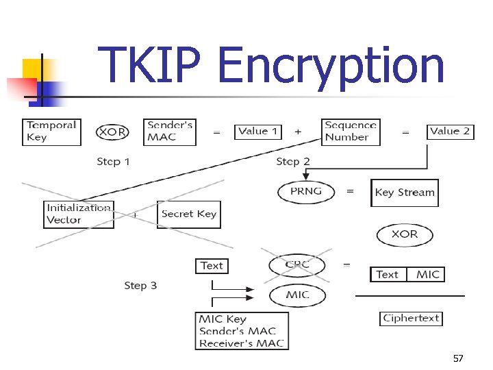 TKIP Encryption 1. 2. 3. Temporal key XORed with sender’s MAC address to create an intermediate Value 1 then mixed with a sequence number to produce Value 2 (the per-packet key) and then entered into the (PRNG), just as with normal WEP Sender’s MAC address and receiver’s MAC address are all run through a MIC function and creates text with MIC key appended; value is then XORed with keystream to create ciphertext 56