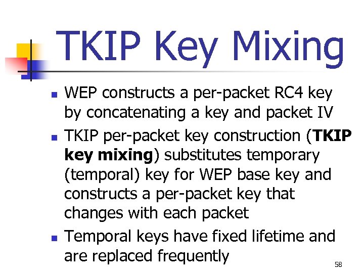TKIP Key Mixing n n n WEP constructs a per-packet RC 4 key by concatenating a key and packet IV TKIP per-packet key construction (TKIP key mixing) substitutes temporary (temporal) key for WEP base key and constructs a per-packet key that changes with each packet Temporal keys have fixed lifetime and are replaced frequently 58