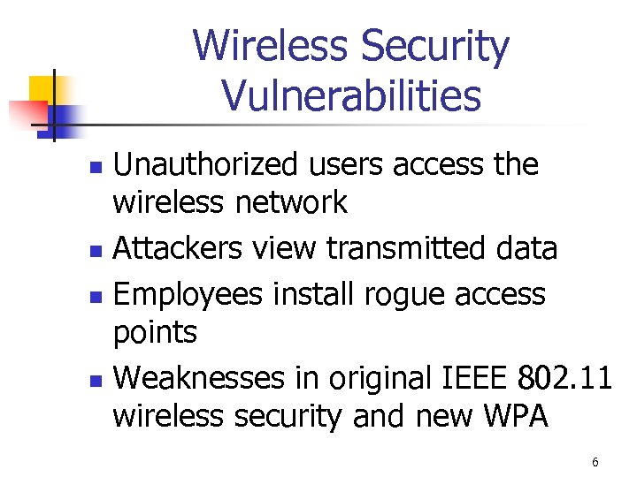 Wireless Security Vulnerabilities Unauthorized users access the wireless network n Attackers view transmitted data n Employees install rogue access points n Weaknesses in original IEEE 802. 11 wireless security and new WPA n 6