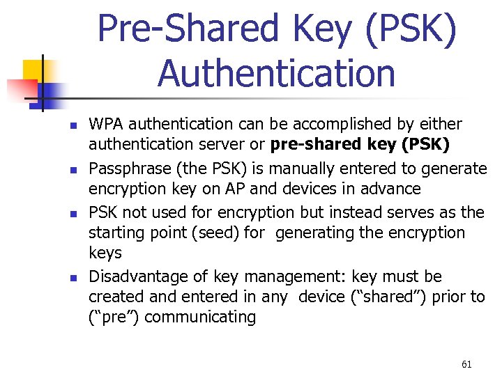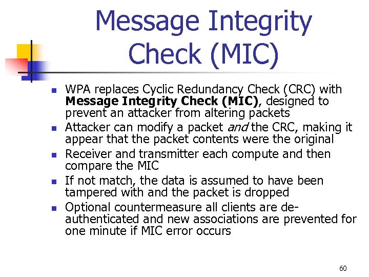 Message Integrity Check (MIC) n n n WPA replaces Cyclic Redundancy Check (CRC) with Message Integrity Check (MIC), designed to prevent an attacker from altering packets Attacker can modify a packet and the CRC, making it appear that the packet contents were the original Receiver and transmitter each compute and then compare the MIC If not match, the data is assumed to have been tampered with and the packet is dropped Optional countermeasure all clients are deauthenticated and new associations are prevented for one minute if MIC error occurs 60