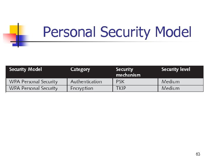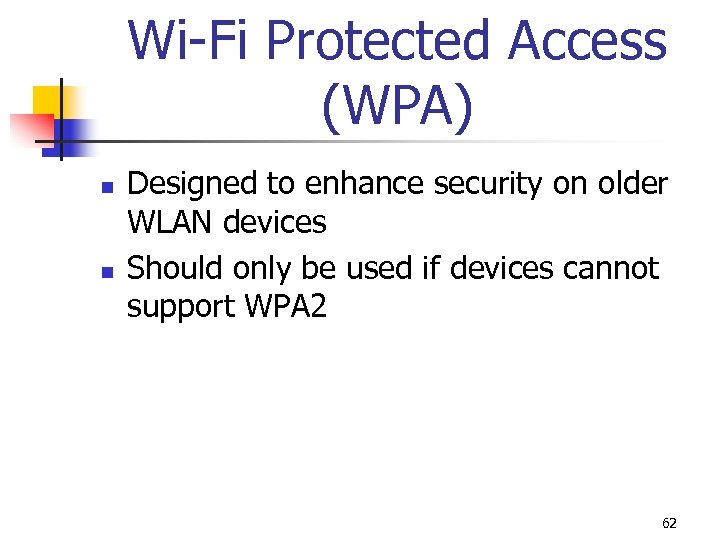 Wi-Fi Protected Access (WPA) n n Designed to enhance security on older WLAN devices Should only be used if devices cannot support WPA 2 62