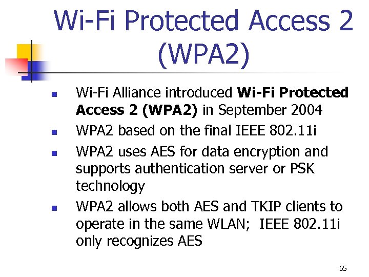 Wi-Fi Protected Access 2 (WPA 2) n n Wi-Fi Alliance introduced Wi-Fi Protected Access 2 (WPA 2) in September 2004 WPA 2 based on the final IEEE 802. 11 i WPA 2 uses AES for data encryption and supports authentication server or PSK technology WPA 2 allows both AES and TKIP clients to operate in the same WLAN; IEEE 802. 11 i only recognizes AES 65