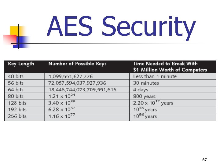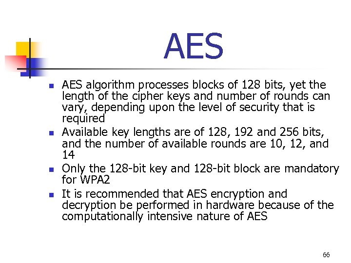 AES n n AES algorithm processes blocks of 128 bits, yet the length of the cipher keys and number of rounds can vary, depending upon the level of security that is required Available key lengths are of 128, 192 and 256 bits, and the number of available rounds are 10, 12, and 14 Only the 128 -bit key and 128 -bit block are mandatory for WPA 2 It is recommended that AES encryption and decryption be performed in hardware because of the computationally intensive nature of AES 66