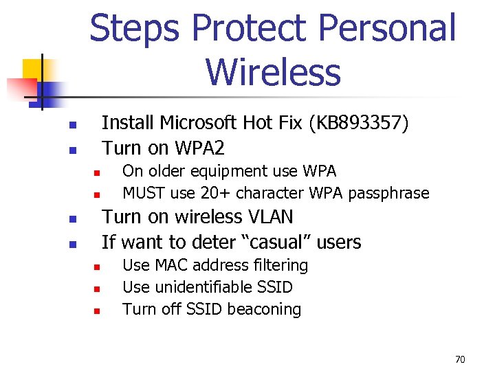 Steps Protect Personal Wireless Install Microsoft Hot Fix (KB 893357) Turn on WPA 2 n n On older equipment use WPA MUST use 20+ character WPA passphrase Turn on wireless VLAN If want to deter “casual” users n n n Use MAC address filtering Use unidentifiable SSID Turn off SSID beaconing 70