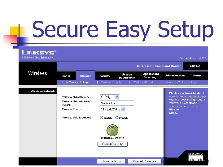Secure Easy Setup Collaboration between Linksys and Broadcom Activate WPA security “at the push of a button” Automatically configures custom SSID and enables WPA dynamic key encryption settings No need to manually enter a passphrase or key Two step process n n n n Push the SES button on access point Click the START SES button on client To add more wireless devices to network simply push the button on the router again to repeat process 76