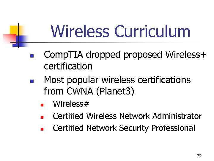 Wireless Curriculum Comp. TIA dropped proposed Wireless+ certification Most popular wireless certifications from CWNA (Planet 3) n n n Wireless# Certified Wireless Network Administrator Certified Network Security Professional 79