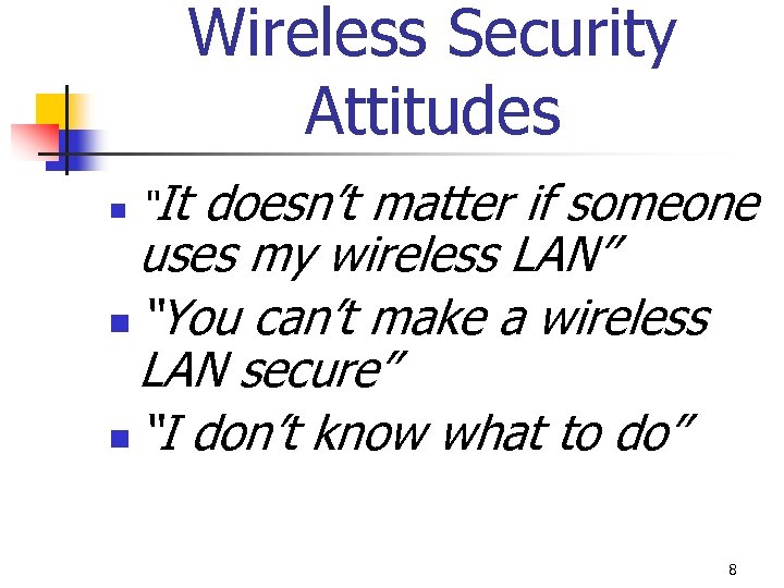Wireless Security Attitudes doesn’t matter if someone uses my wireless LAN” n “You can’t make a wireless LAN secure” n “I don’t know what to do” n “It 8