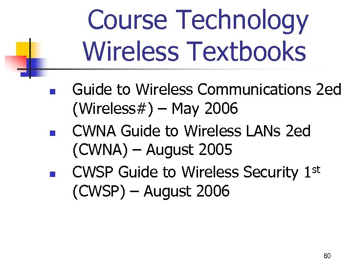 Course Technology Wireless Textbooks n n n Guide to Wireless Communications 2 ed (Wireless#) – May 2006 CWNA Guide to Wireless LANs 2 ed (CWNA) – August 2005 CWSP Guide to Wireless Security 1 st (CWSP) – August 2006 80