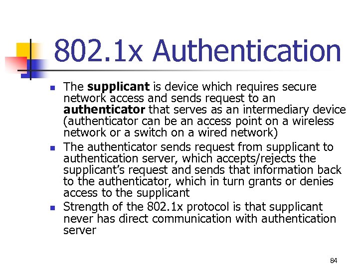 802. 1 x n n n IEEE 802. 11 i authentication and key management uses IEEE 802. 1 x (originally developed for wired networks) 802. 1 x port security (device requests access to network prevented from receiving any traffic until its identity can be verified) 802. 1 x blocks all traffic on port-by-port basis until the client is authenticated using credentials stored on authentication server 83