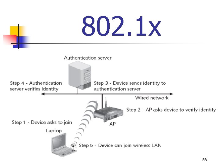 802. 1 x 1. 2. 3. 4. 5. Device requests from AP permission to join WLAN AP asks device to verify its identity Device sends identity information to AP, which passes encrypted information to authentication server Authentication server verifies/rejects client’s identity and returns information to AP Approved client now join the network 85