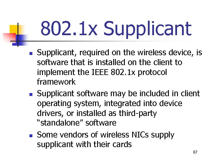 802. 1 x Supplicant n n n Supplicant, required on the wireless device, is software that is installed on the client to implement the IEEE 802. 1 x protocol framework Supplicant software may be included in client operating system, integrated into device drivers, or installed as third-party “standalone” software Some vendors of wireless NICs supply supplicant with their cards 87