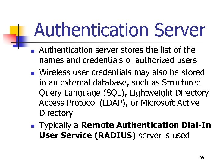 Authentication Server n n n Authentication server stores the list of the names and credentials of authorized users Wireless user credentials may also be stored in an external database, such as Structured Query Language (SQL), Lightweight Directory Access Protocol (LDAP), or Microsoft Active Directory Typically a Remote Authentication Dial-In User Service (RADIUS) server is used 88