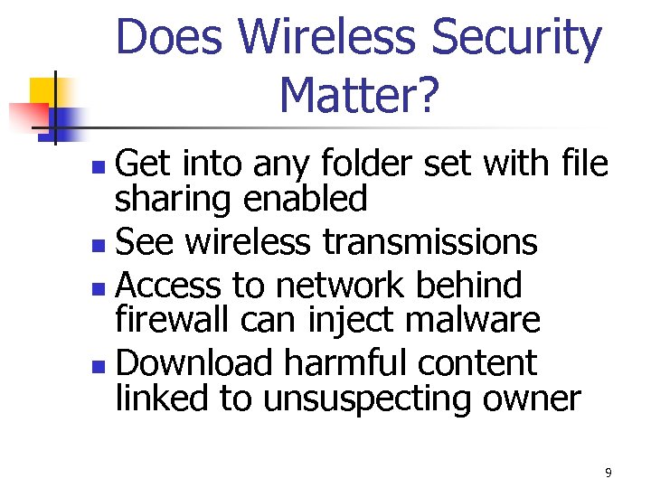 Does Wireless Security Matter? Get into any folder set with file sharing enabled n See wireless transmissions n Access to network behind firewall can inject malware n Download harmful content linked to unsuspecting owner n 9