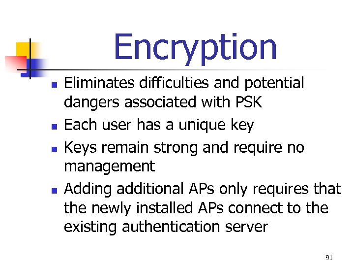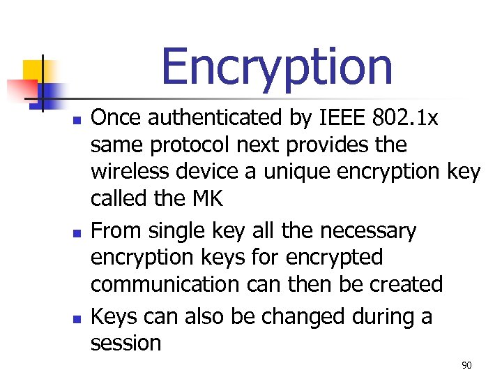 Encryption n Once authenticated by IEEE 802. 1 x same protocol next provides the wireless device a unique encryption key called the MK From single key all the necessary encryption keys for encrypted communication can then be created Keys can also be changed during a session 90
