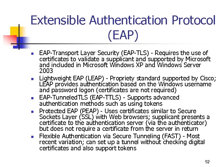 Extensible Authentication Protocol (EAP) n n n EAP-Transport Layer Security (EAP-TLS) - Requires the use of certificates to validate a supplicant and supported by Microsoft and included in Microsoft Windows XP and Windows Server 2003 Lightweight EAP (LEAP) - Propriety standard supported by Cisco; LEAP provides authentication based on the Windows username and password logon (certificates are not required) EAP-Tunneled. TLS (EAP-TTLS) - Supports advanced authentication methods such as using tokens Protected EAP (PEAP) - Uses certificates similar to Secure Sockets Layer (SSL) with Web browsers; supplicant presents a certificate to the authentication server (via the authenticator) but does not require a certificate from the server in return Flexible Authentication via Secure Tunneling (FAST) - Most recent variation; can set up a tunnel without checking digital certificates and also support tokens 92