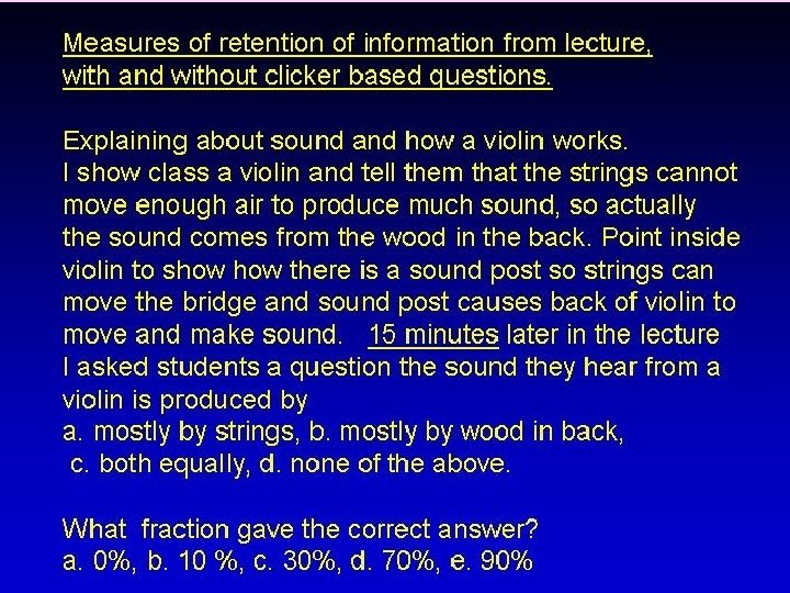 How well do students learn in lecture? A cautionary tale…. • about a violin…. From Carl Weiman’s* “Physics of Everyday Life” class. *Nobel prize winner AND good teacher