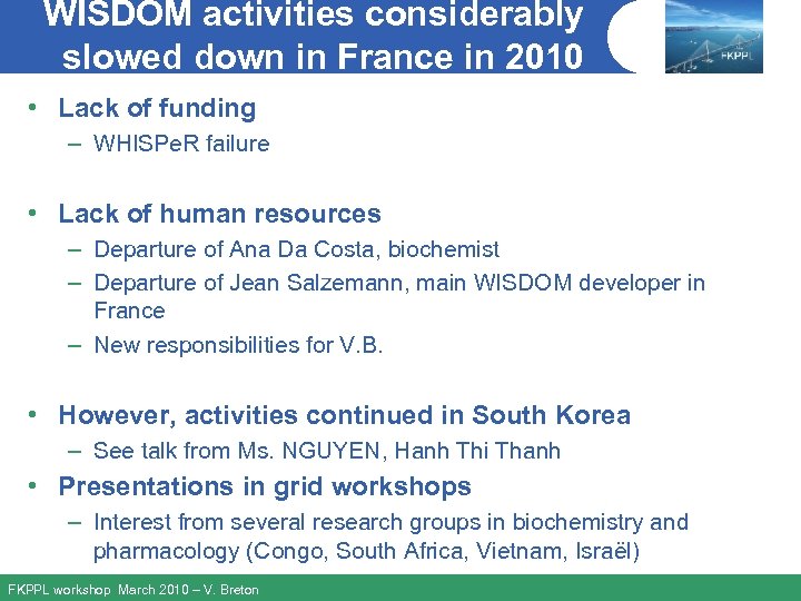 WISDOM activities considerably slowed down in France in 2010 • Lack of funding – WHISPe. R failure • Lack of human resources – Departure of Ana Da Costa, biochemist – Departure of Jean Salzemann, main WISDOM developer in France – New responsibilities for V. B. • However, activities continued in South Korea – See talk from Ms. NGUYEN, Hanh Thi Thanh • Presentations in grid workshops – Interest from several research groups in biochemistry and pharmacology (Congo, South Africa, Vietnam, Israël) FKPPL workshop March 2010 – V. Breton