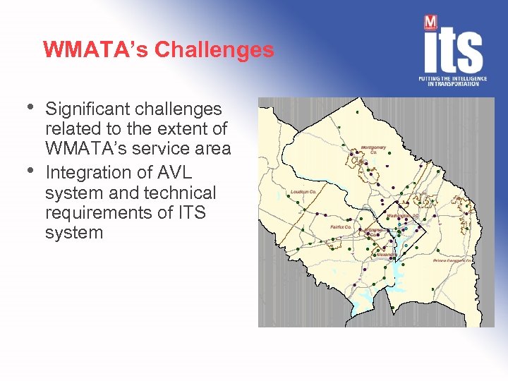 WMATA’s Challenges • • Significant challenges related to the extent of WMATA’s service area Integration of AVL system and technical requirements of ITS system