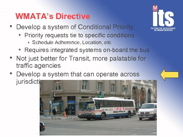 WMATA’s Directive • Develop a system of Conditional Priority • Priority requests tie to specific conditions • Schedule Adherence, Location, etc • • • Requires integrated systems on-board the bus Not just better for Transit, more palatable for traffic agencies Develop a system that can operate across jurisdictions